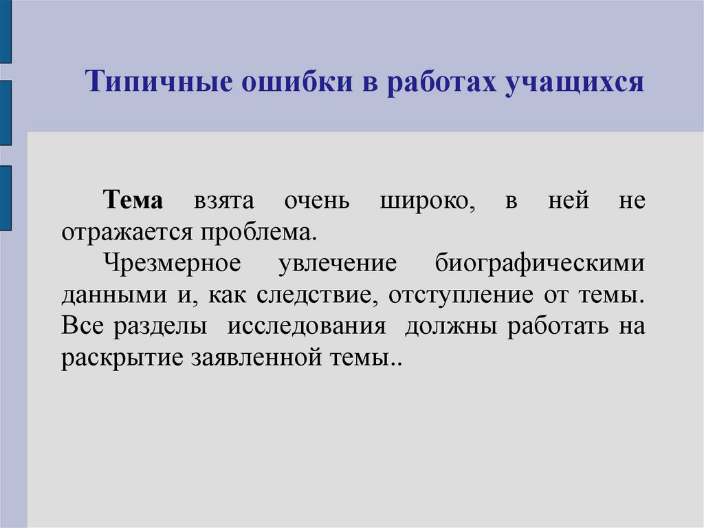 Типичные ошибки в работах учащихсяТема взята очень широко, в ней не