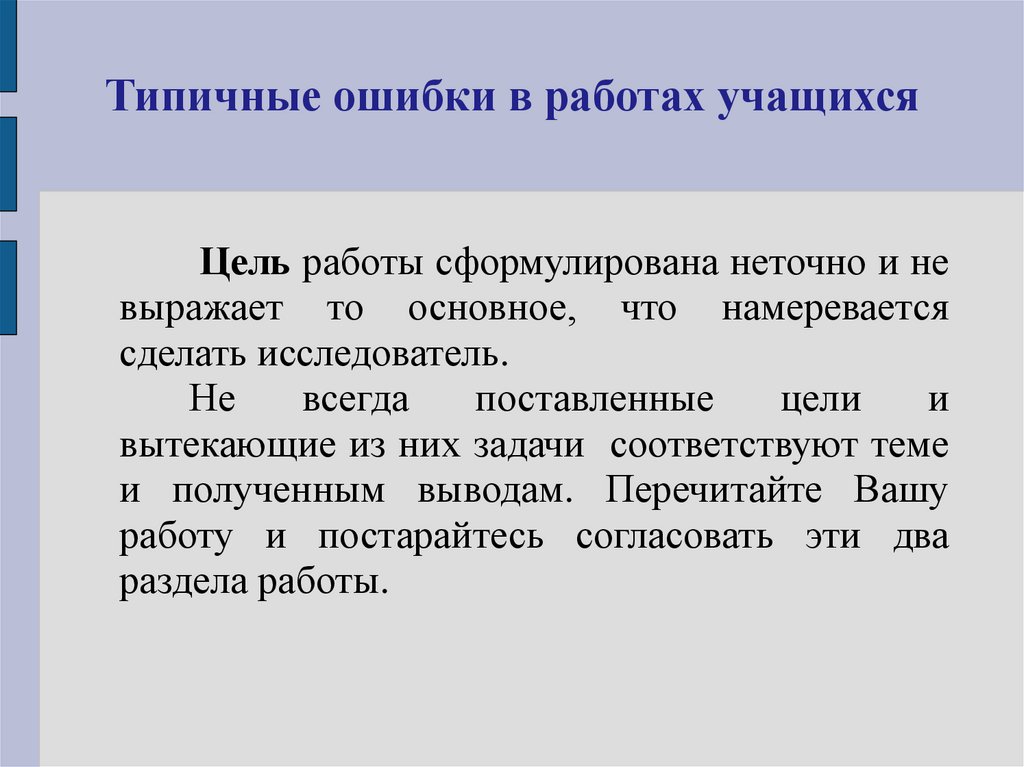 Типичные ошибки в работах учащихсяЦель работы сформулирована неточно и не