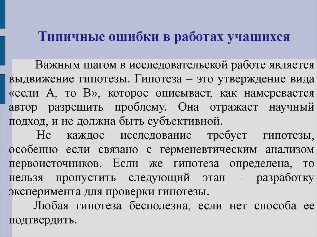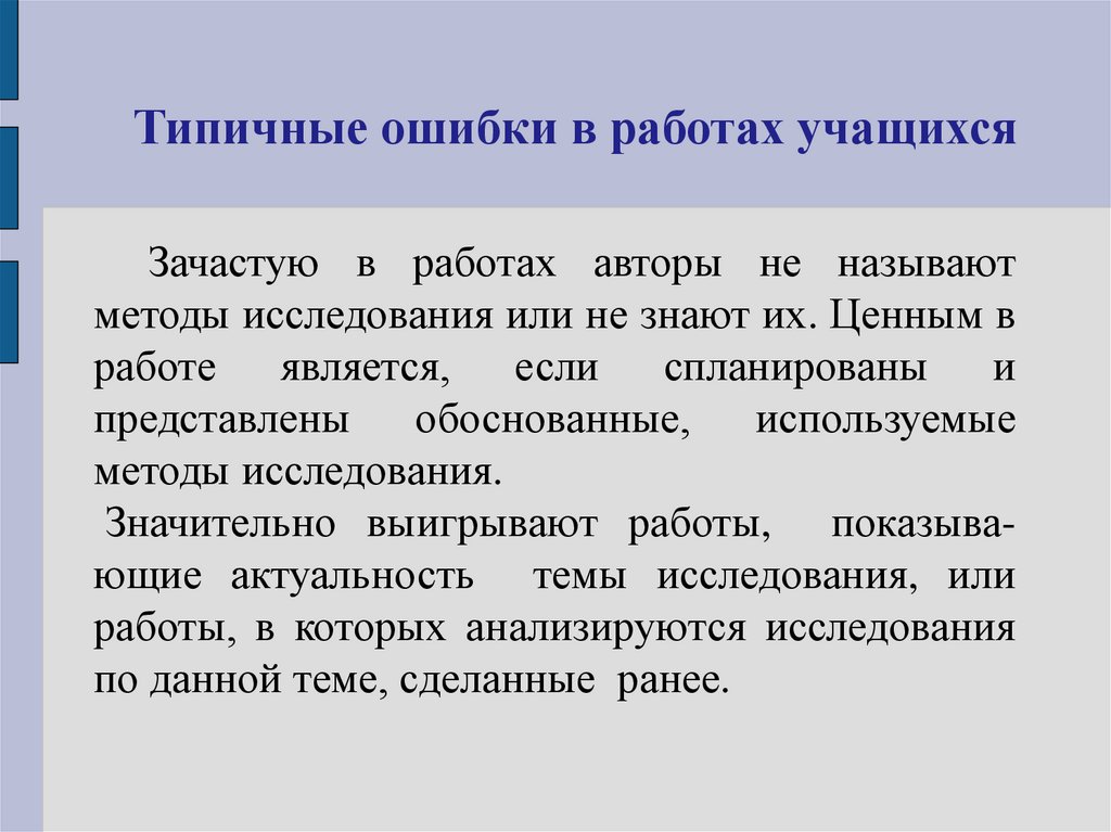 Типичные ошибки в работах учащихсяВажным шагом в исследовательской работе является