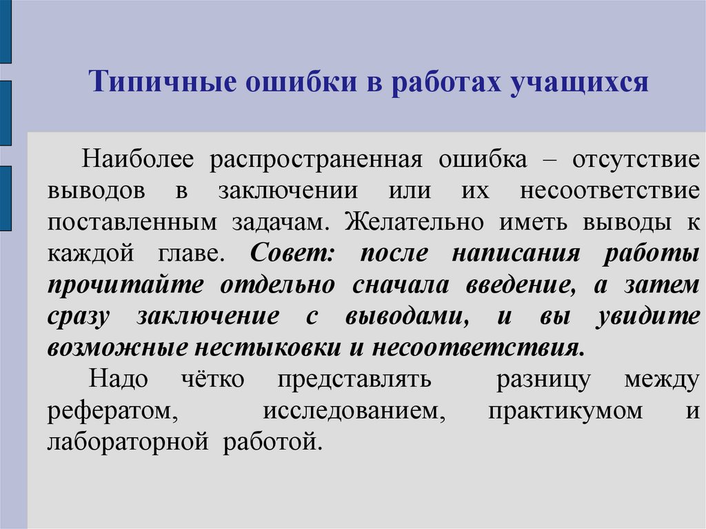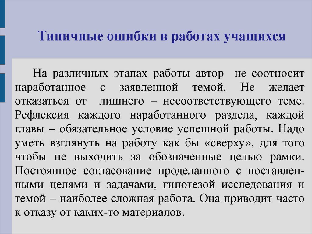 Типичные ошибки в работах учащихсяНа различных этапах работы автор не соотносит