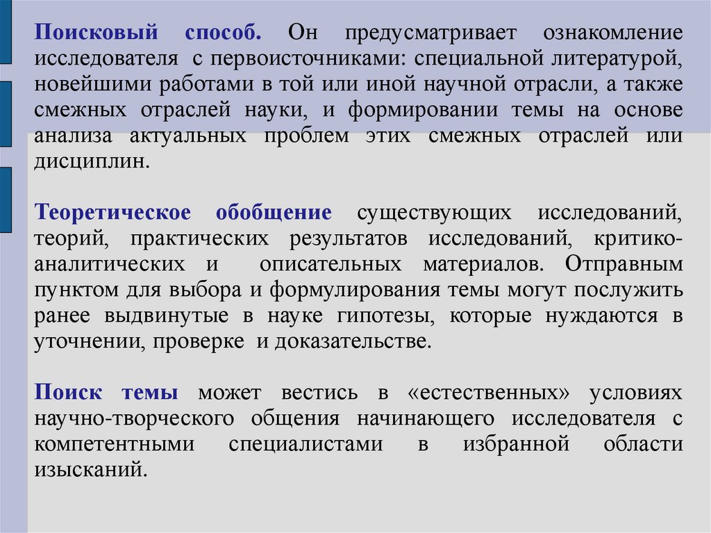 Поисковый способ. Он предусматривает ознакомлениеисследователя с первоисточниками: специальной литературой,