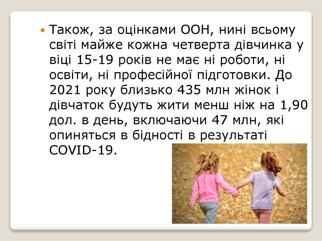 Також, за оцінками ООН, нині всьомусвіті майже кожна четверта дівчинка у