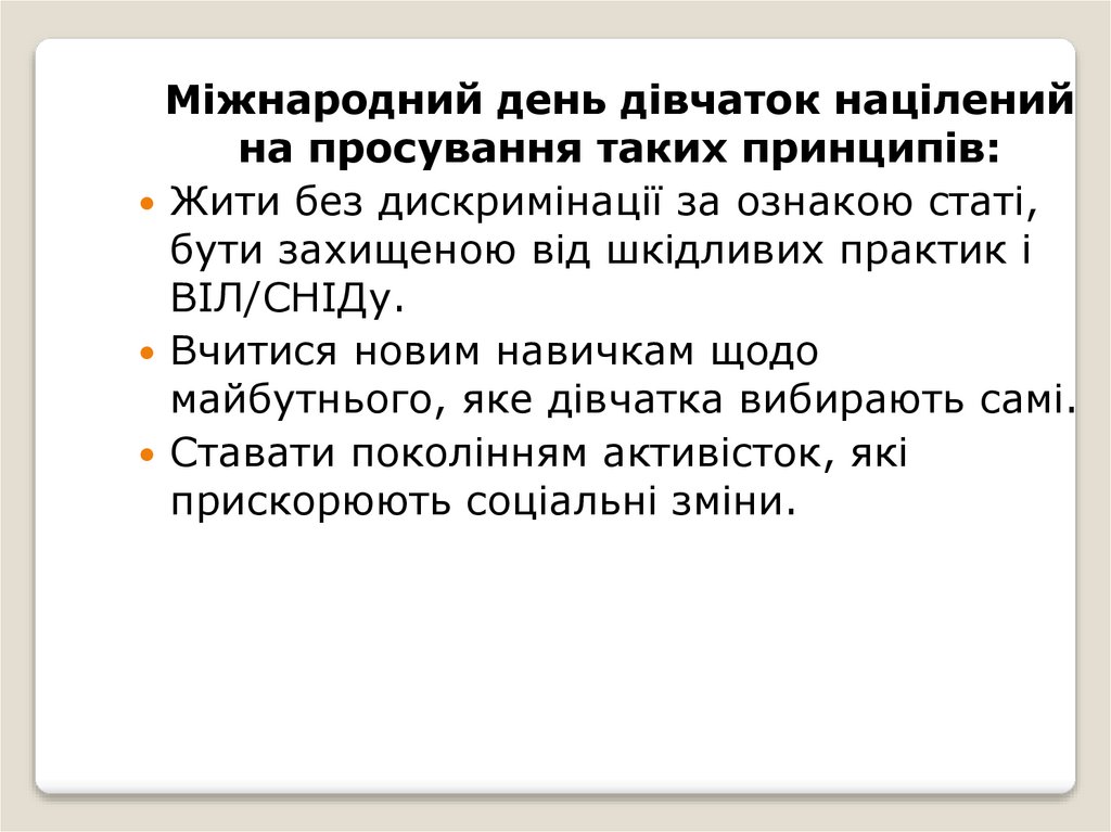 Міжнародний день дівчаток націленийна просування таких принципів: