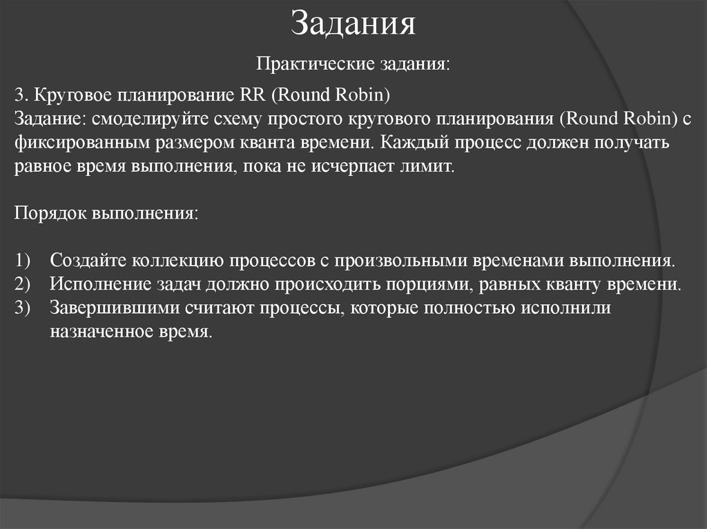 2) Исполнение задач должно происходить порциями, равных кванту времени.