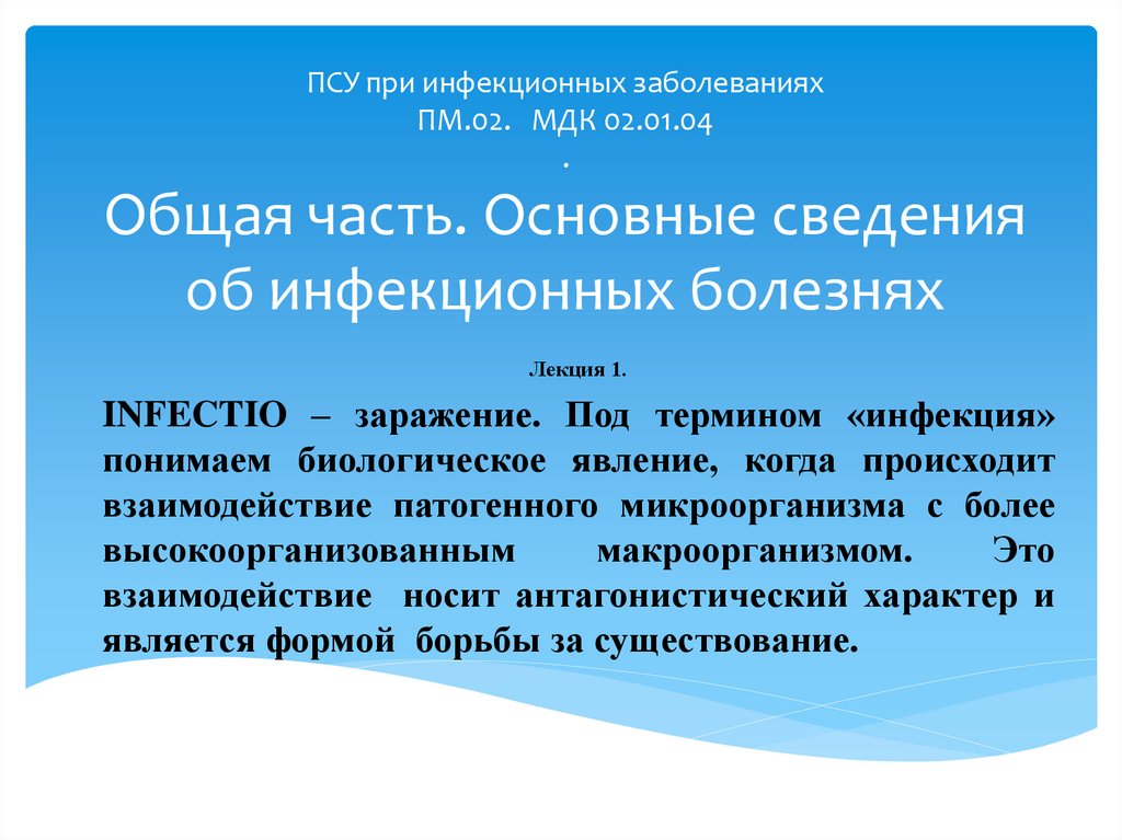 1. ПСУ при инфекционных заболеваниях ПМ.02. МДК 02.01.04 ПСУ при инфекционных заболеваниях ПМ.02. МДК 02.01.04 . Общая часть.