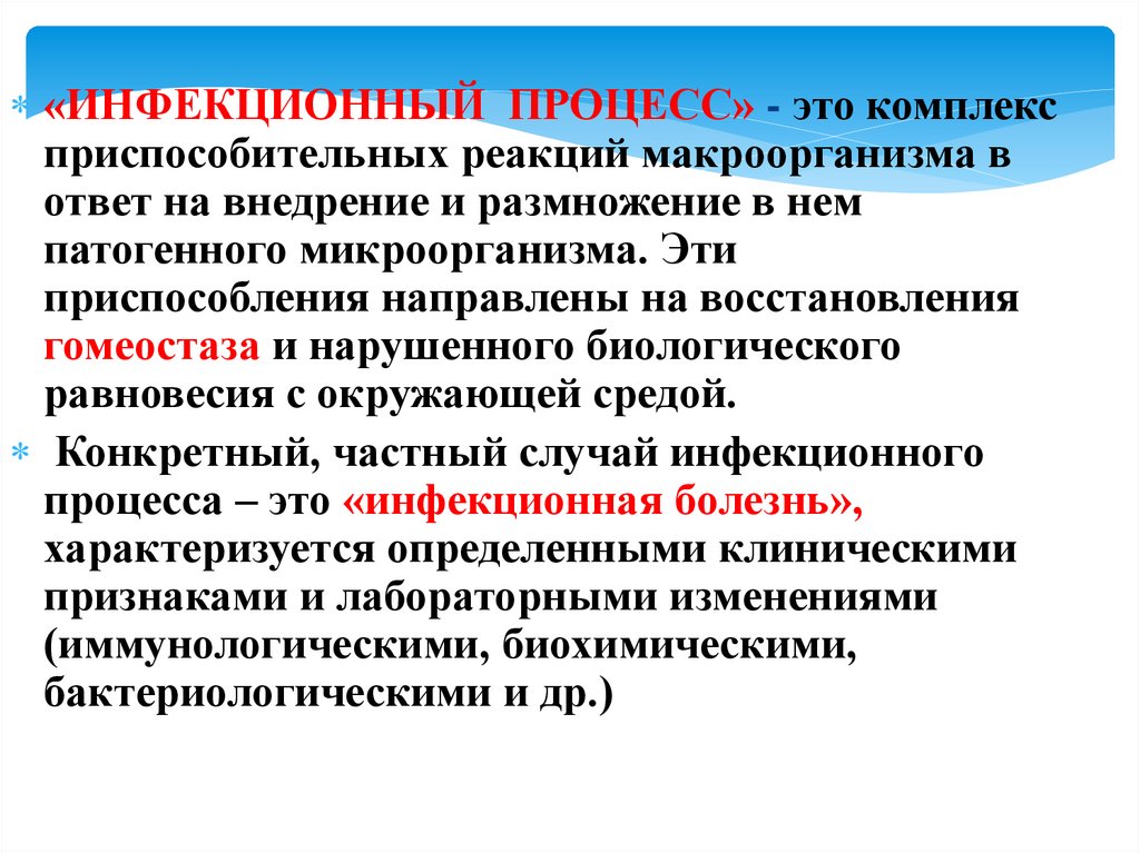 «ИНФЕКЦИОННЫЙ ПРОЦЕСС» - это комплексприспособительных реакций макроорганизма в