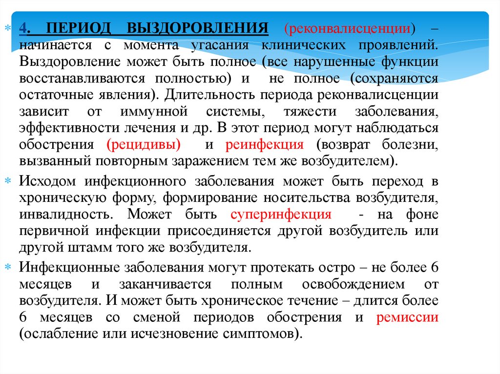 4. ПЕРИОД ВЫЗДОРОВЛЕНИЯ (реконвалисценции) –начинается с момента угасания клинических проявлений.