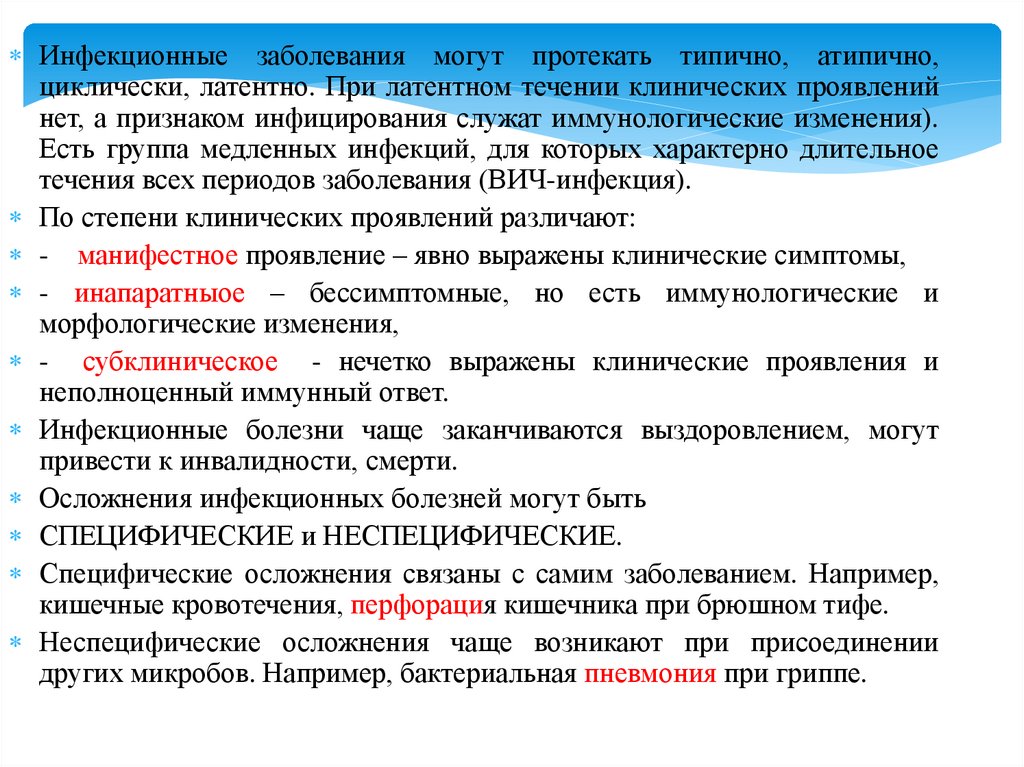 Инфекционные заболевания могут протекать типично, атипично,циклически, латентно. При латентном течении клинических проявлений