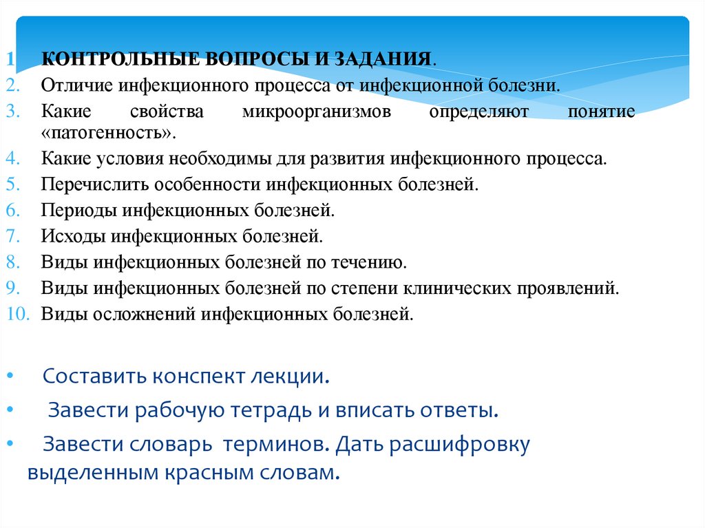 КОНТРОЛЬНЫЕ ВОПРОСЫ И ЗАДАНИЯ.Отличие инфекционного процесса от инфекционной болезни.