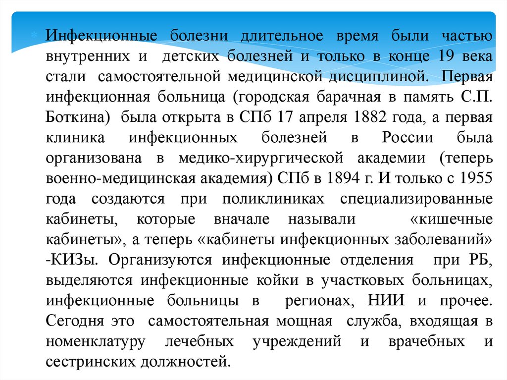 Инфекционные болезни длительное время были частьювнутренних и детских болезней и только в конце 19 века