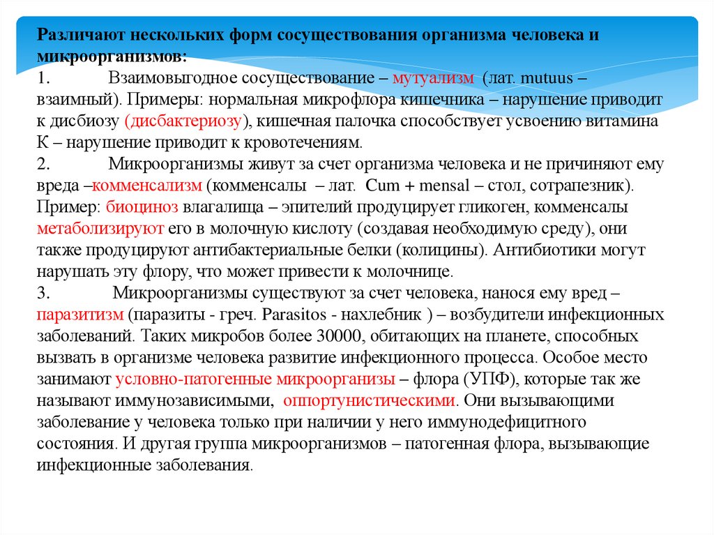 Различают нескольких форм сосуществования организма человека имикроорганизмов: