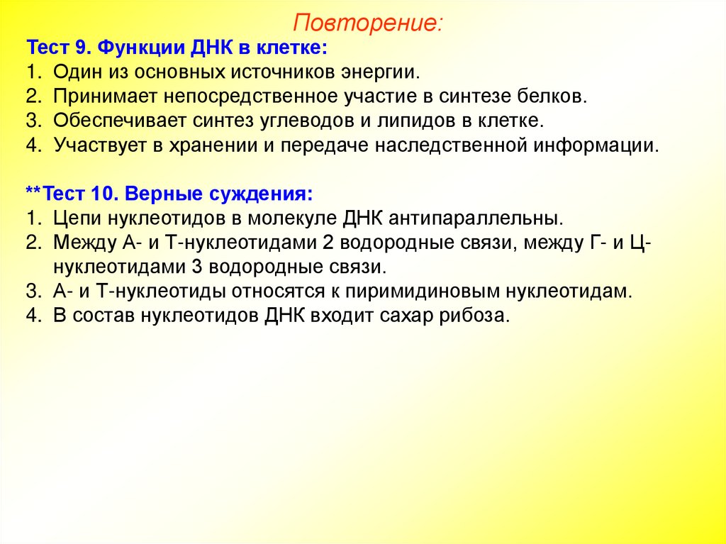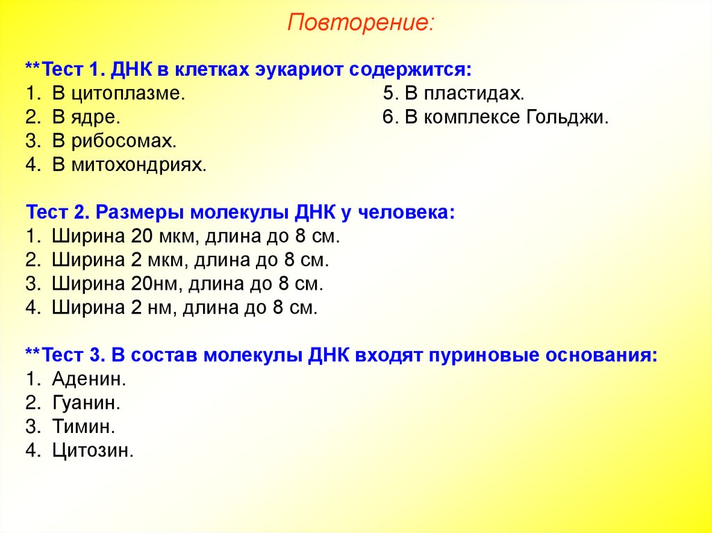 Повторение:**Тест 1. ДНК в клетках эукариот содержится: