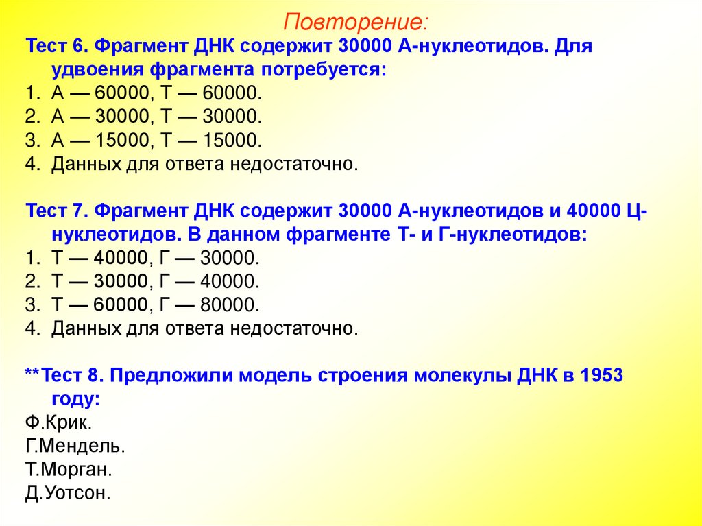 Повторение:Тест 6. Фрагмент ДНК содержит 30000 А-нуклеотидов. Для
