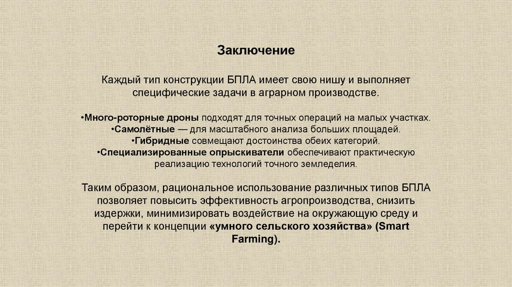 ЗаключениеКаждый тип конструкции БПЛА имеет свою нишу и выполняет
