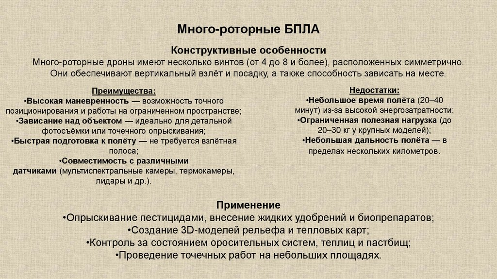 •Много-роторные дроны подходят для точных операций на малых участках.