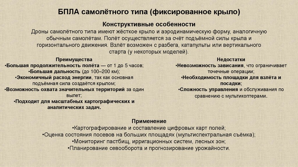 БПЛА самолётного типа (фиксированное крыло)Конструктивные особенности