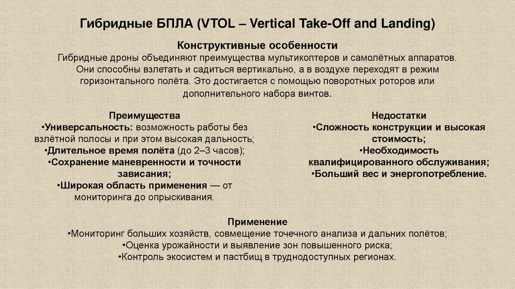 Гибридные БПЛА (VTOL – Vertical Take-Off and Landing)Конструктивные особенности