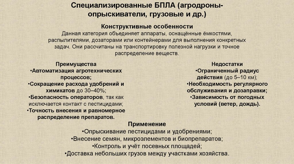Специализированные БПЛА (агродроныопрыскиватели, грузовые и др.)Конструктивные особенности