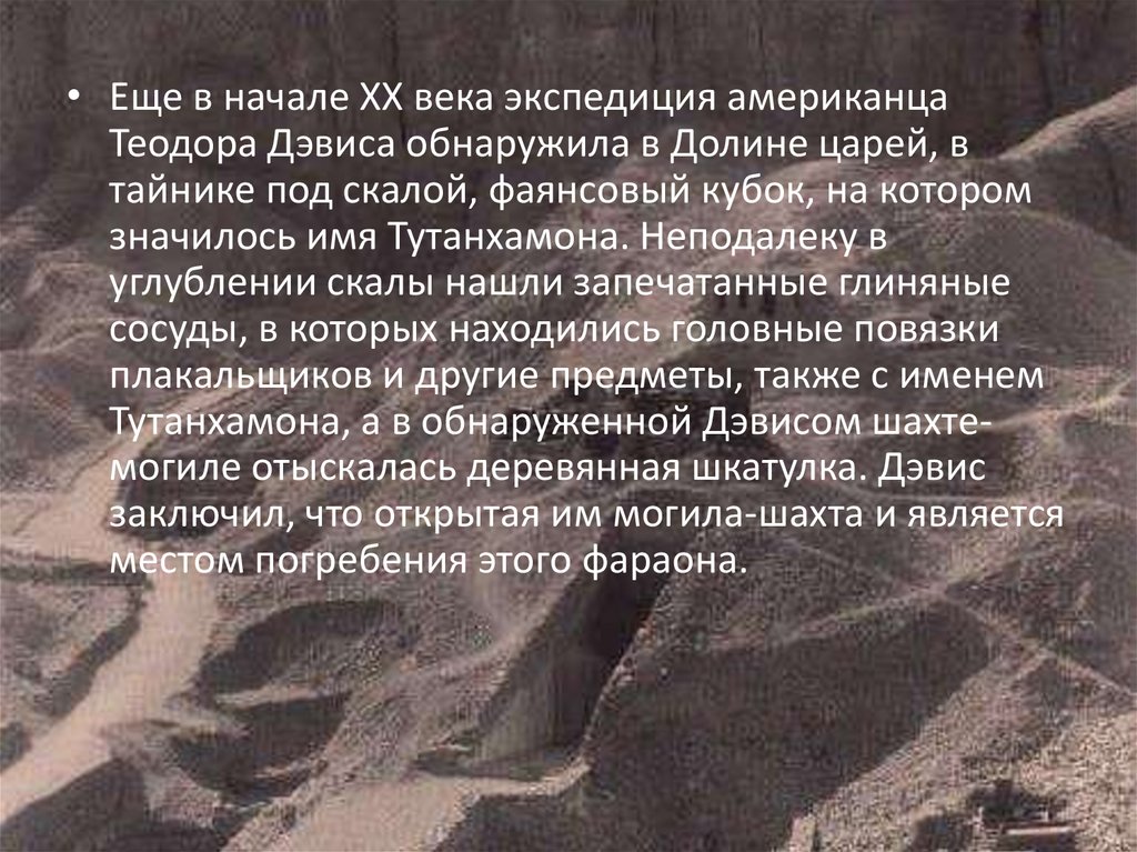 • Еще в начале XX века экспедиция американцаТеодора Дэвиса обнаружила в Долине царей, в