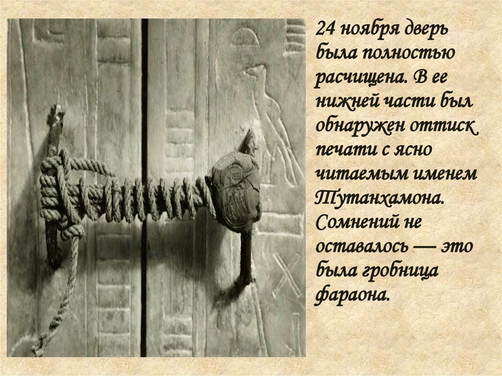 Только с 17 февраля Картер продолжил работы и вскрыл замурованную дверьв усыпальную камеру, в ней оказался огромный деревянный саркофаг, обитый