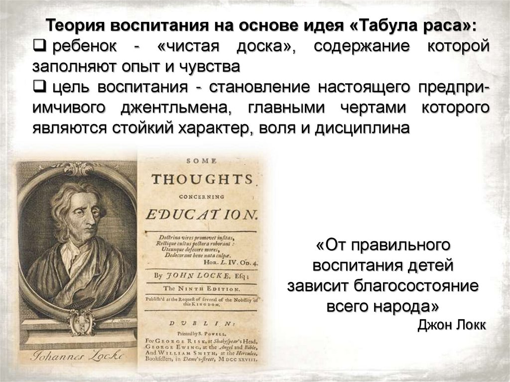 Теория воспитания на основе идея «Табула раса»:ребенок - «чистая доска», содержание которой