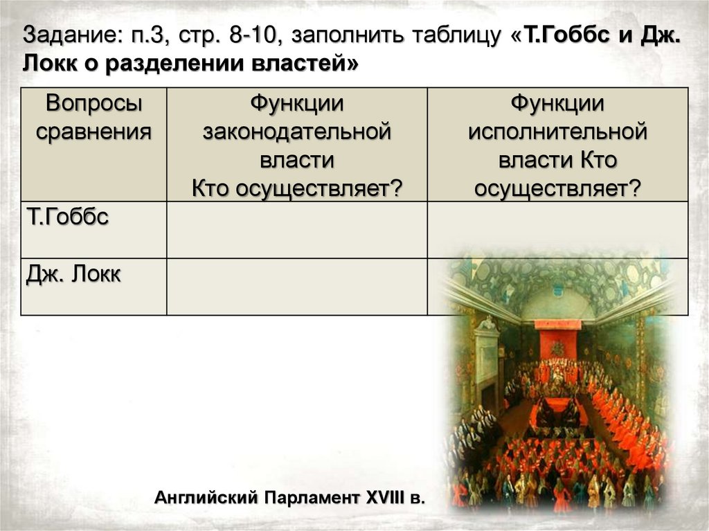 Задание: п.3, стр. 8-10, заполнить таблицу «Т.Гоббс и Дж.Локк о разделении властей»