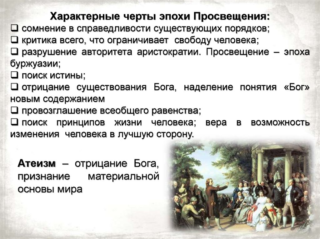 Характерные черты эпохи Просвещения:сомнение в справедливости существующих порядков;