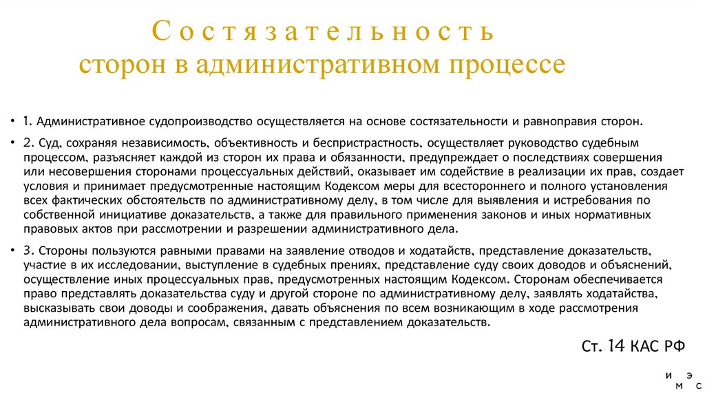 • 1. Административное судопроизводство осуществляется на основе состязательности и равноправия сторон.