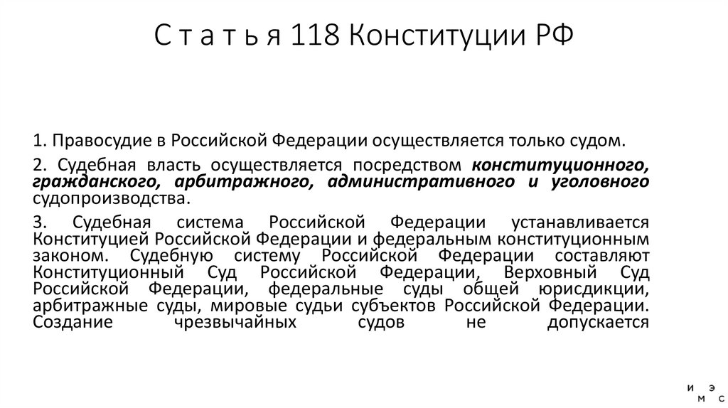 С т а т ь я 118 Конституции РФ1. Правосудие в Российской Федерации осуществляется только судом.