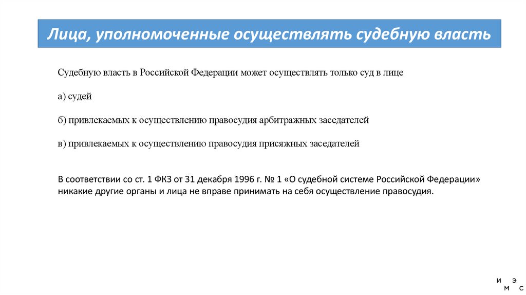 Лица, уполномоченные осуществлять судебную властьСудебную власть в Российской Федерации может осуществлять только суд в лице