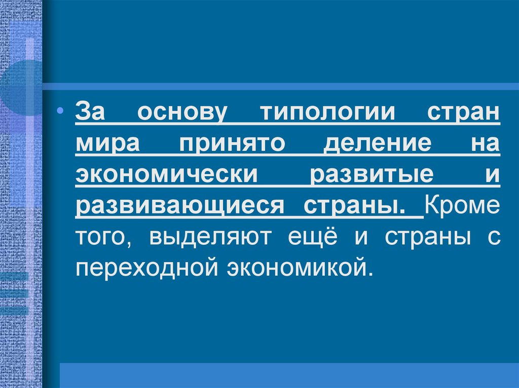• В основу типологии стран берут важные качественныепризнаки, определяющие место страны на политической и