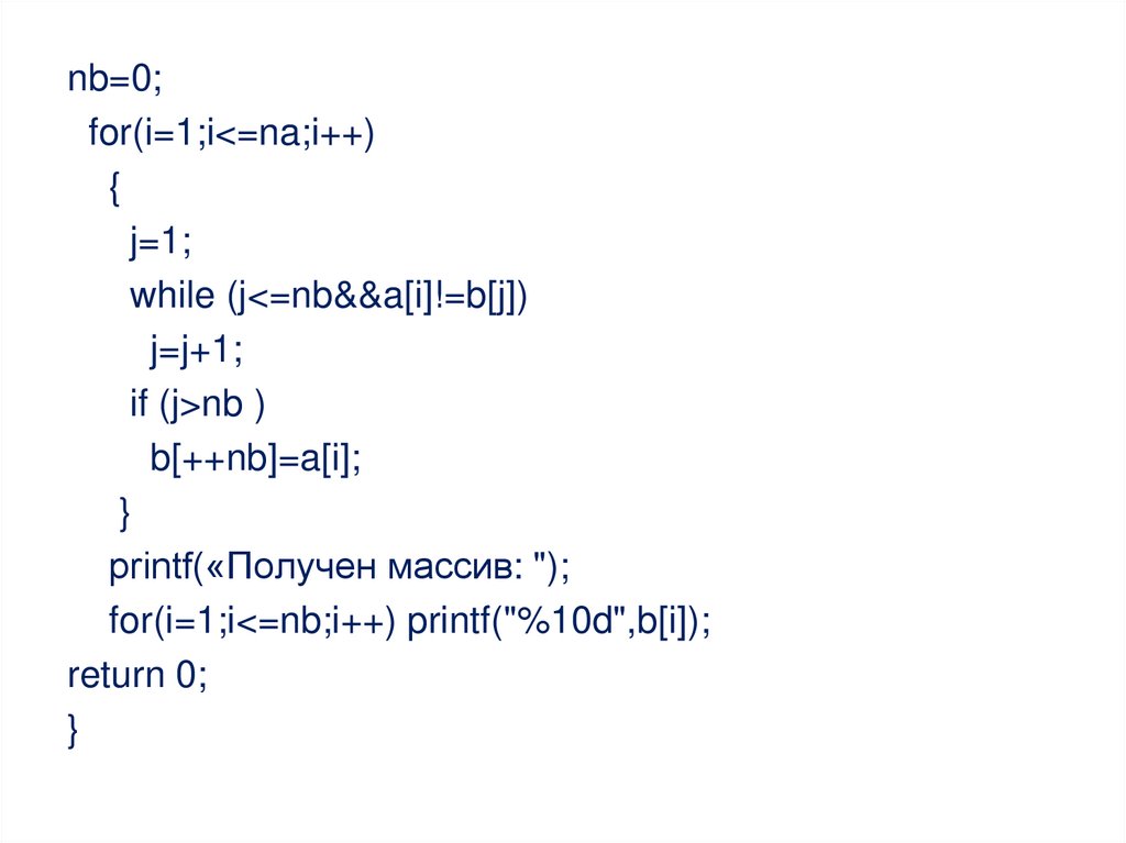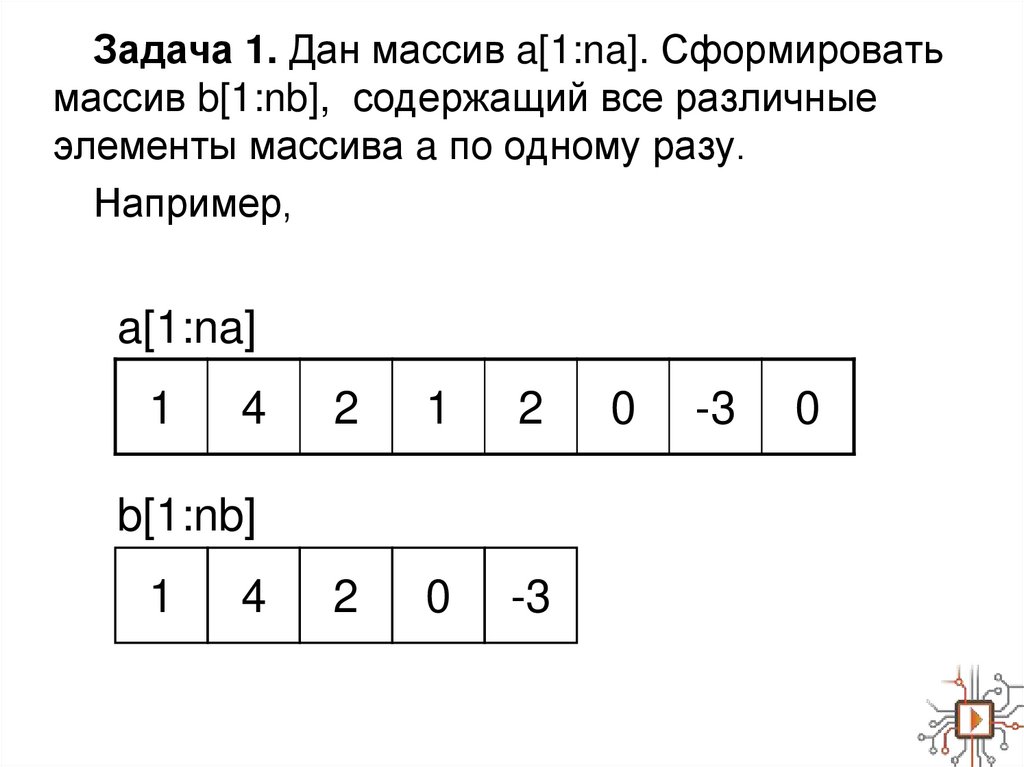 Задача 1. Дан массив a[1:na]. Сформироватьмассив b[1:nb], содержащий все различные