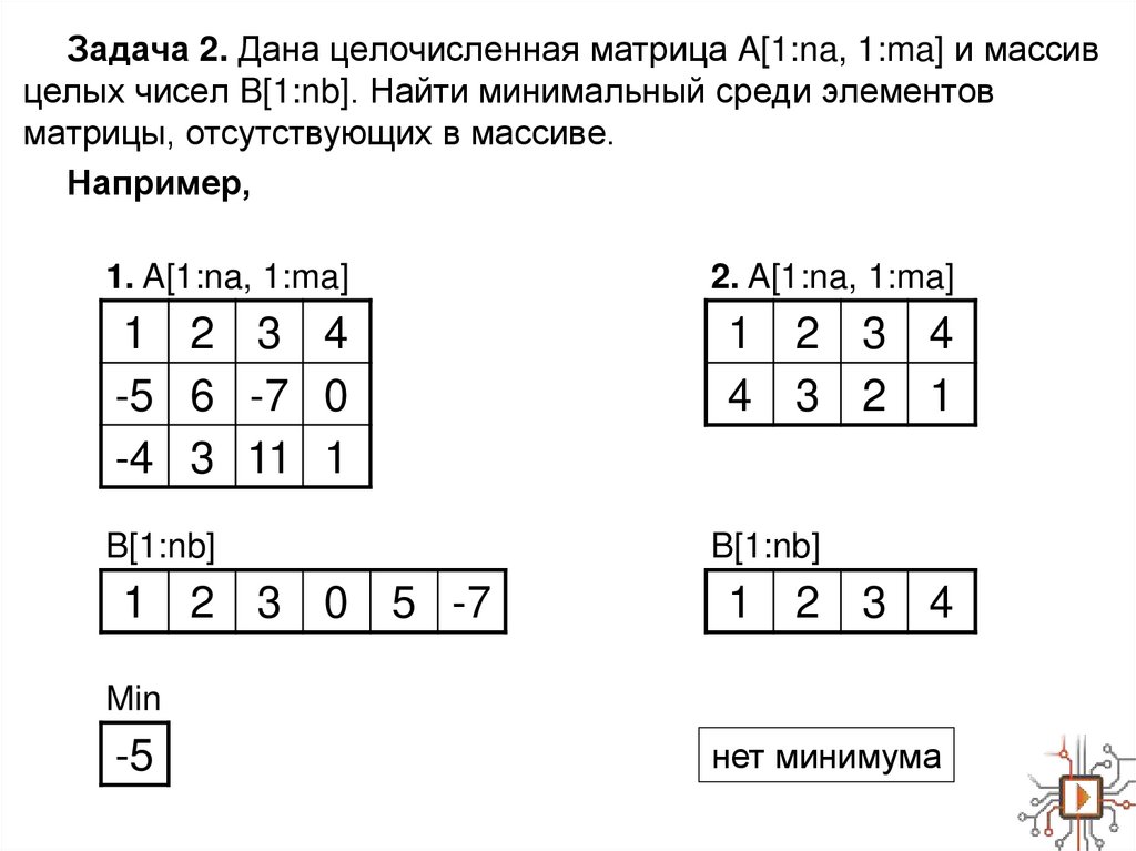 Задача 2. Дана целочисленная матрица A[1:na, 1:ma] и массивцелых чисел B[1:nb]. Найти минимальный среди элементов