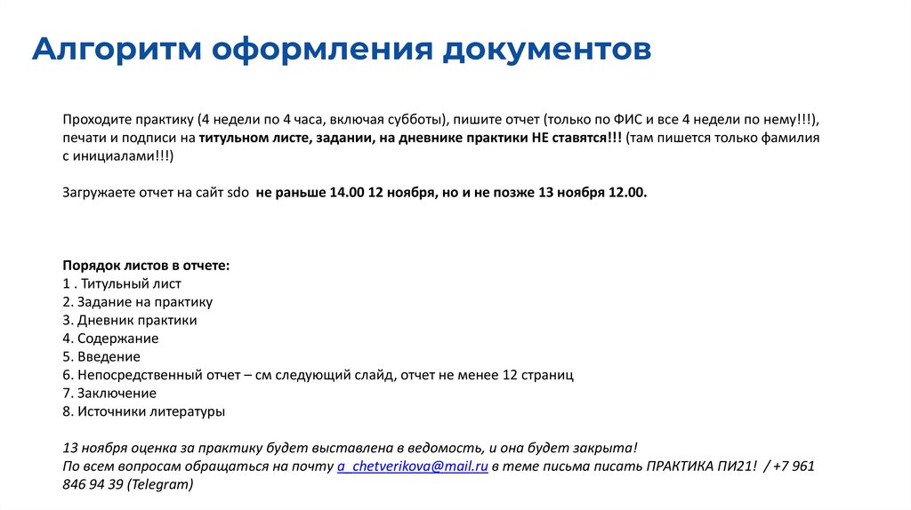 Алгоритм оформления документовПроходите практику (4 недели по 4 часа, включая субботы), пишите отчет (только по ФИС и все 4 недели по нему!!!),