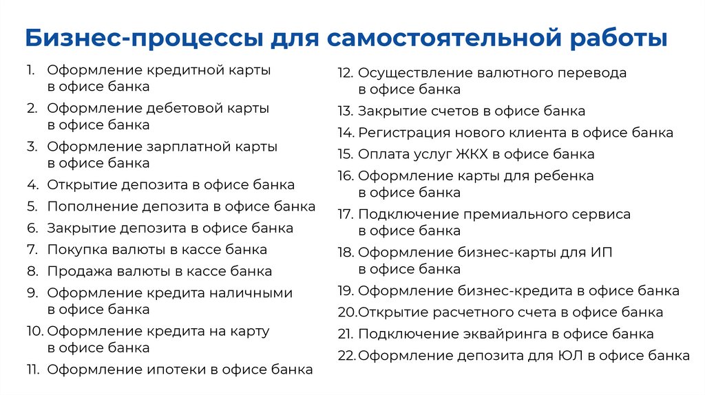 Бизнес-процессы для самостоятельной работы1. Оформление кредитной карты
