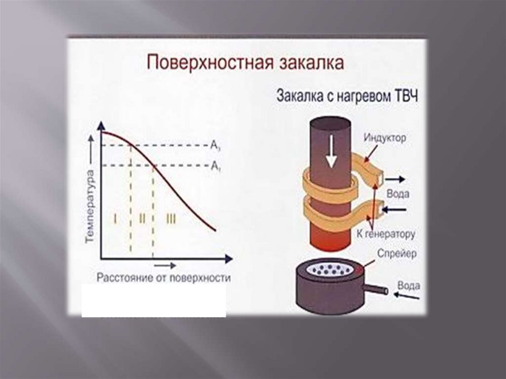 48. Поверхностная закалка стали: а – распределение температур по сечению; б – структура при поверхностном нагреве; в – структура