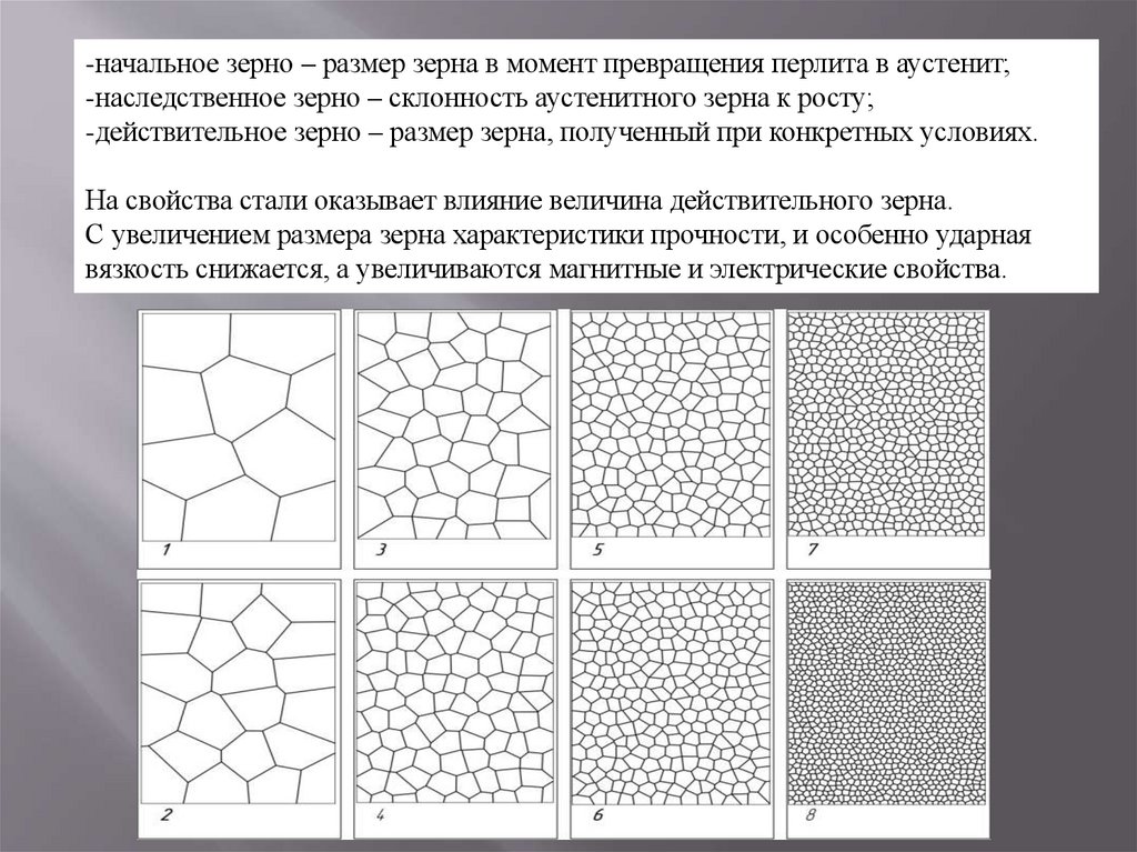 -начальное зерно – размер зерна в момент превращения перлита в аустенит;-наследственное зерно – склонность аустенитного зерна к росту;