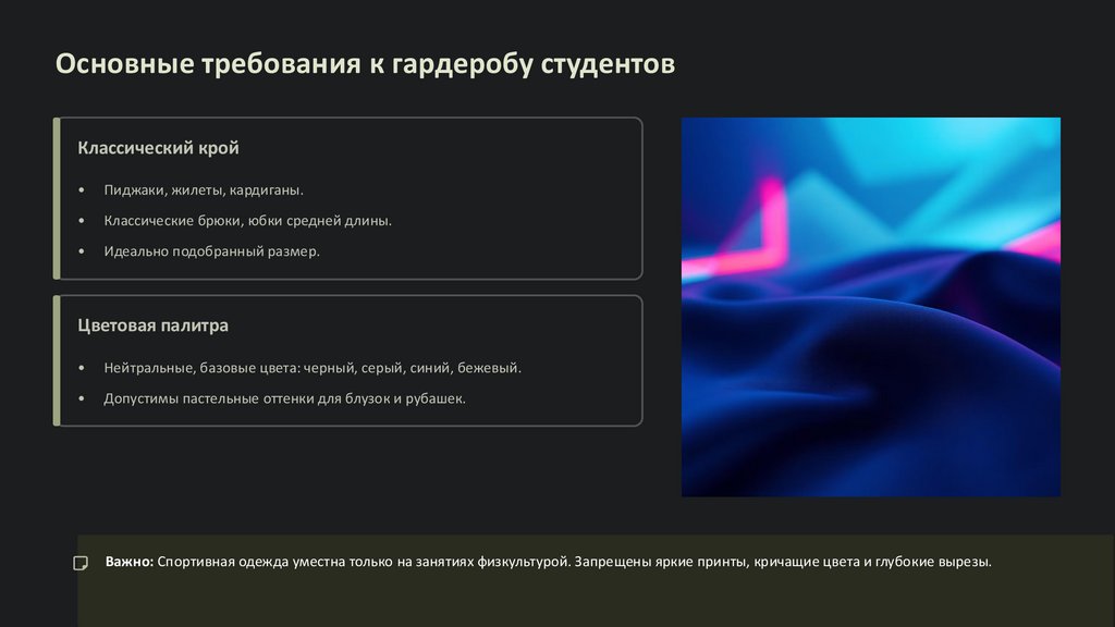 Важно: Спортивная одежда уместна только на занятиях физкультурой. Запрещены яркие принты, кричащие цвета и глубокие вырезы.