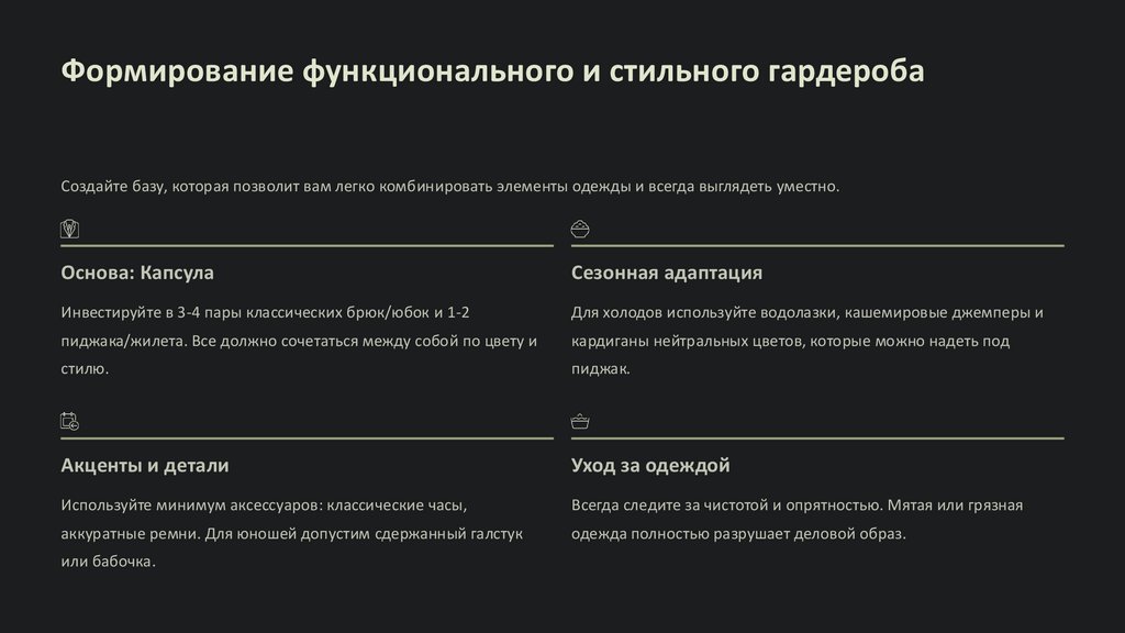 Формирование функционального и стильного гардеробаСоздайте базу, которая позволит вам легко комбинировать элементы одежды и всегда выглядеть уместно.