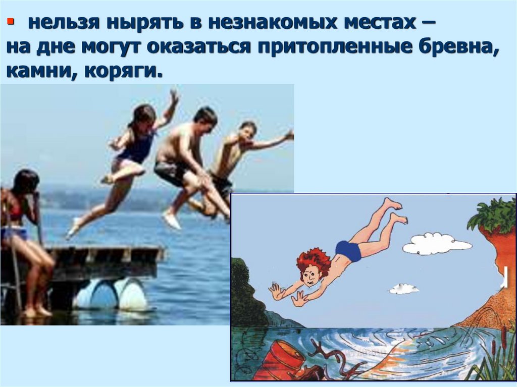 нельзя нырять в незнакомых местах –на дне могут оказаться притопленные бревна,