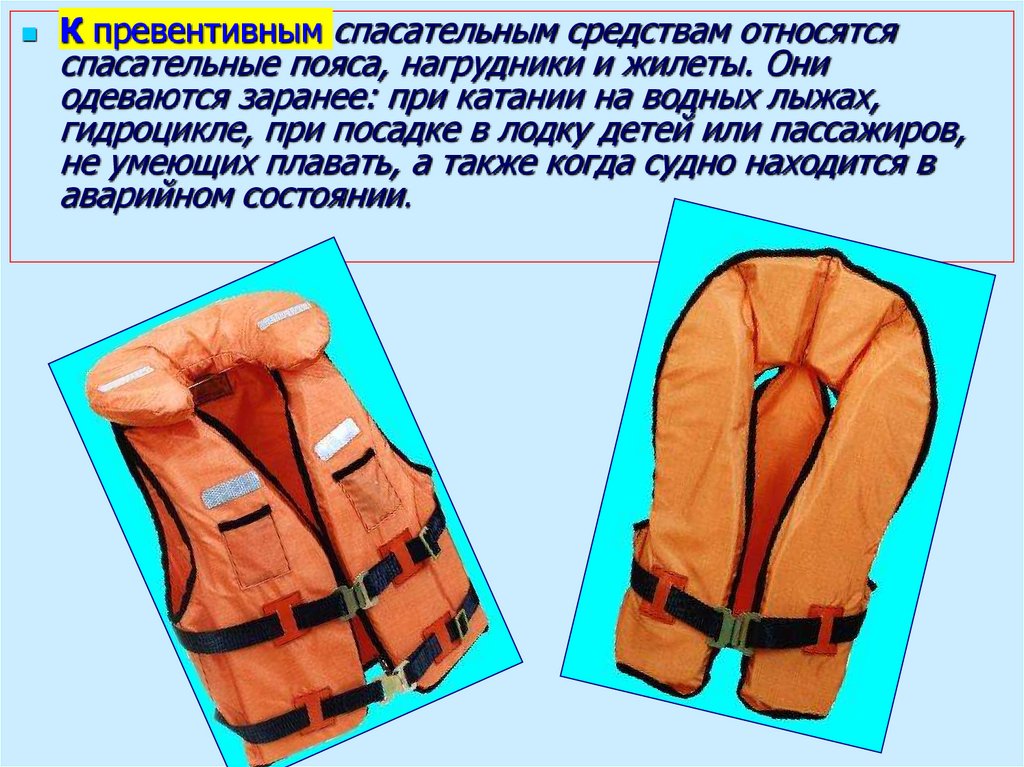 К превентивным спасательным средствам относятсяспасательные пояса, нагрудники и жилеты. Они
