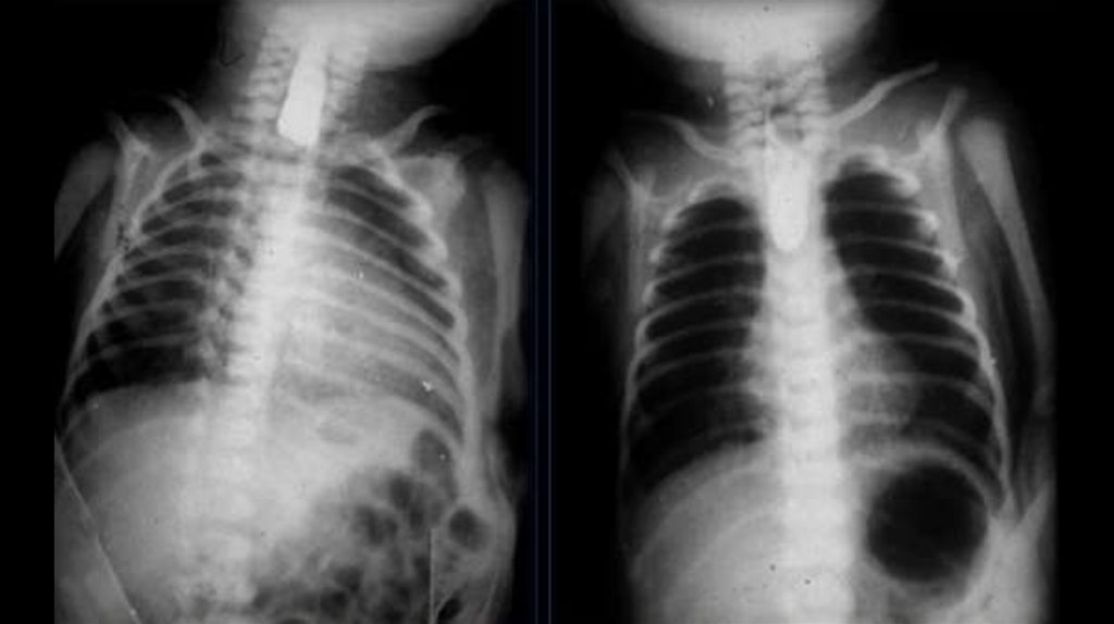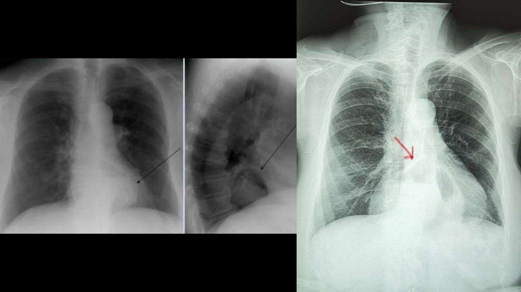 свидетельствует о задержке содержимого в пищеводе. Определяется также стриктура дистального отдела пищевода. (Справа) На рентгенограмме,