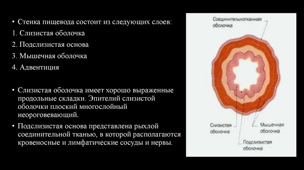 • Стенка пищевода состоит из следующих слоев:1. Слизистая оболочка
