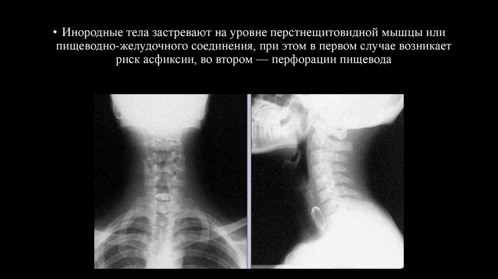 • Инородные тела застревают на уровне перстнещитовидной мышцы илипищеводно-желудочного соединения, при этом в первом случае возникает