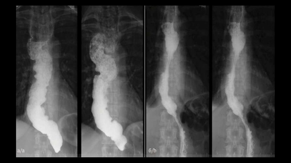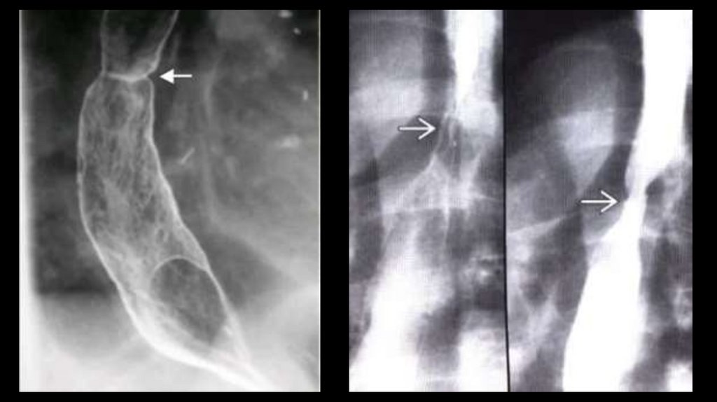 • (Слева) На рентгенограмме пищевода, выполненной во время рентгеноскопии у женщины 29 лет с дисфагией и одышкой, визуализируетсярасширенный, атоничный пищевод со стриктурой в дистальных отделах. Перистальтика пищевода полностью отсутствует. (Справа) На КТ