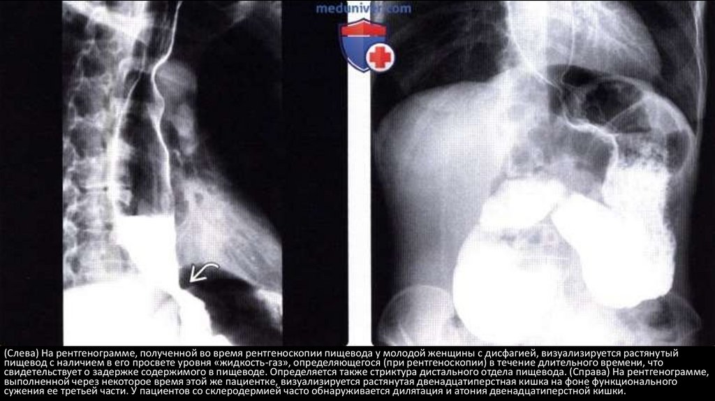 (Слева) На рентгенограмме, полученной во время рентгеноскопии пищевода у молодой женщины с дисфагией, визуализируется растянутыйпищевод с наличием в его просвете уровня «жидкость-газ», определяющегося (при рентгеноскопии) в течение длительного времени, что