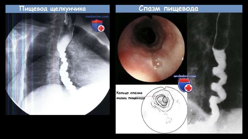 • «Пищевод щелкунчика» (синоним — сегментарный спазм пищевода) —нарушение моторики пищевода, при котором наблюдаются сокращения