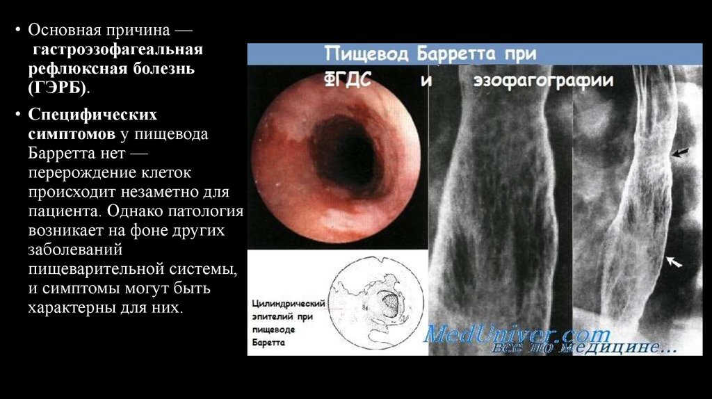 • Пищевод Барретта (метаплазия Барретта) — предраковое состояние. Этопатологическое изменение слизистой оболочки пищевода, при котором типичный