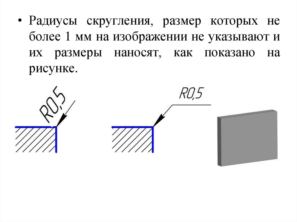 • Радиусы скругления, размер которых неболее 1 мм на изображении не указывают и