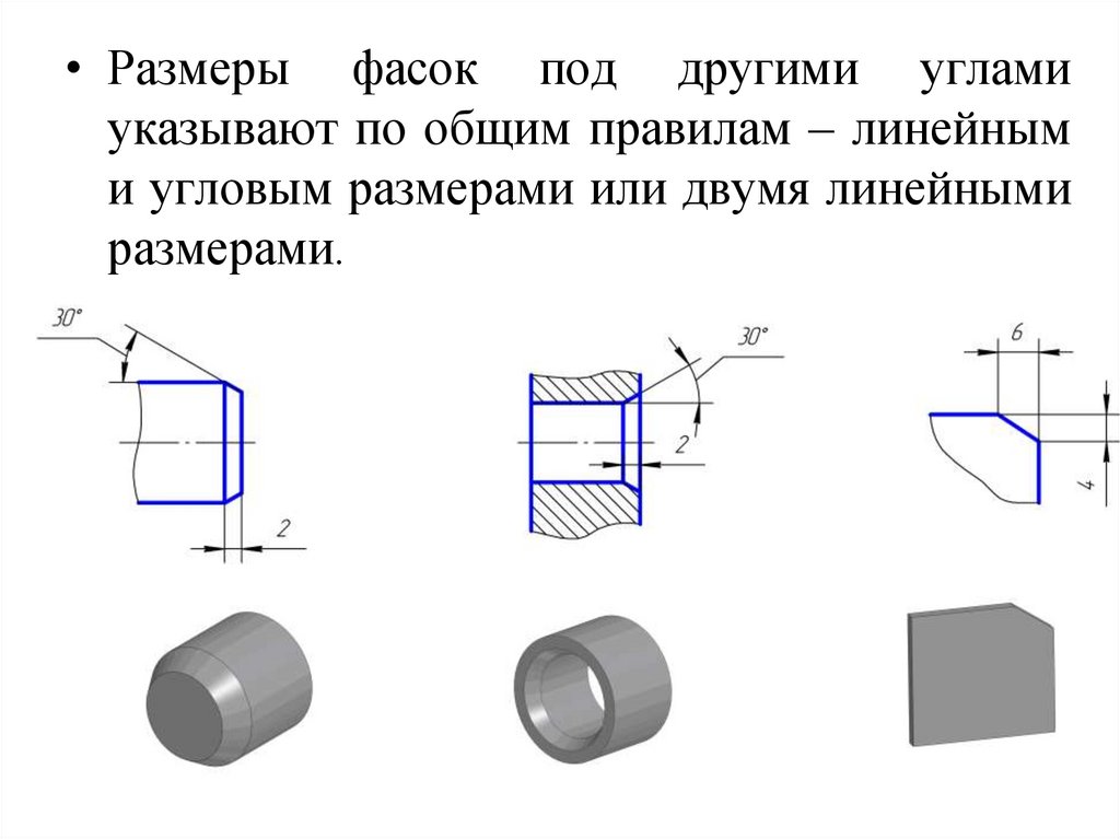 • Размеры фасок под другими угламиуказывают по общим правилам – линейным